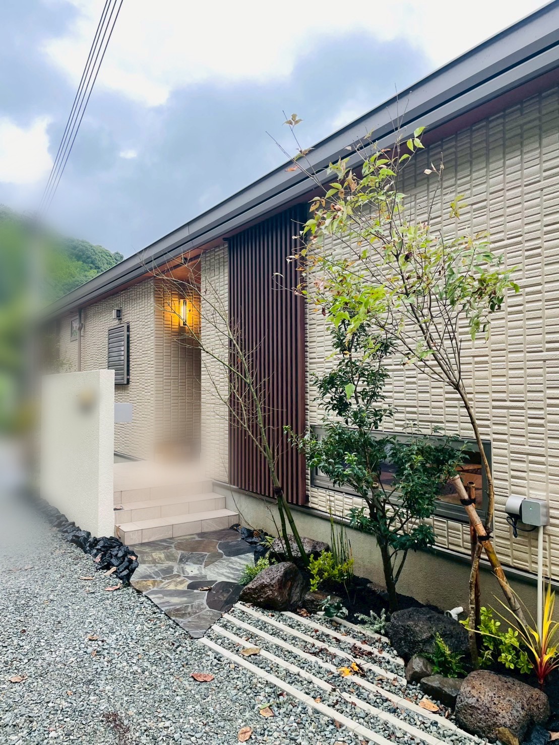 建物前面スペースが限られているため、石材、グラスハイブリックボーダー、大根島石など質感の違う製品を組み合わせ面白みのあるアプローチを演出しました。
