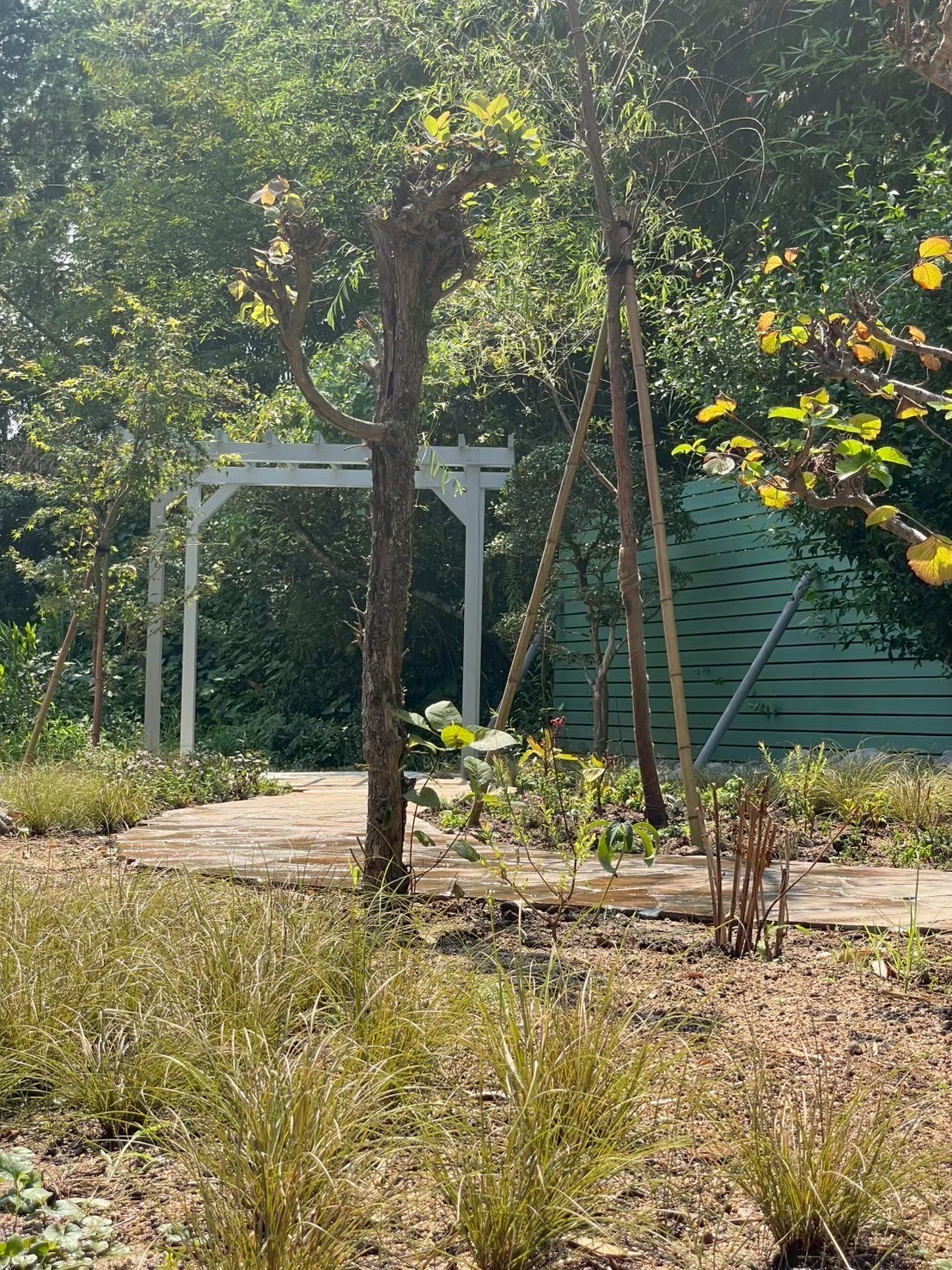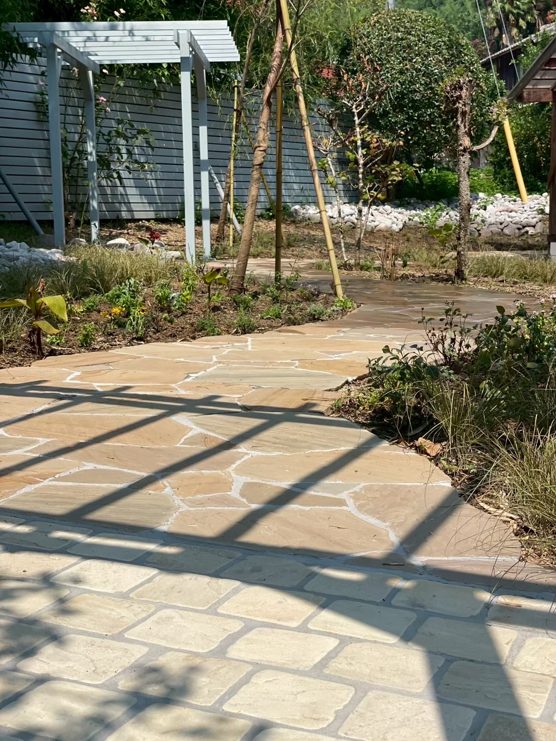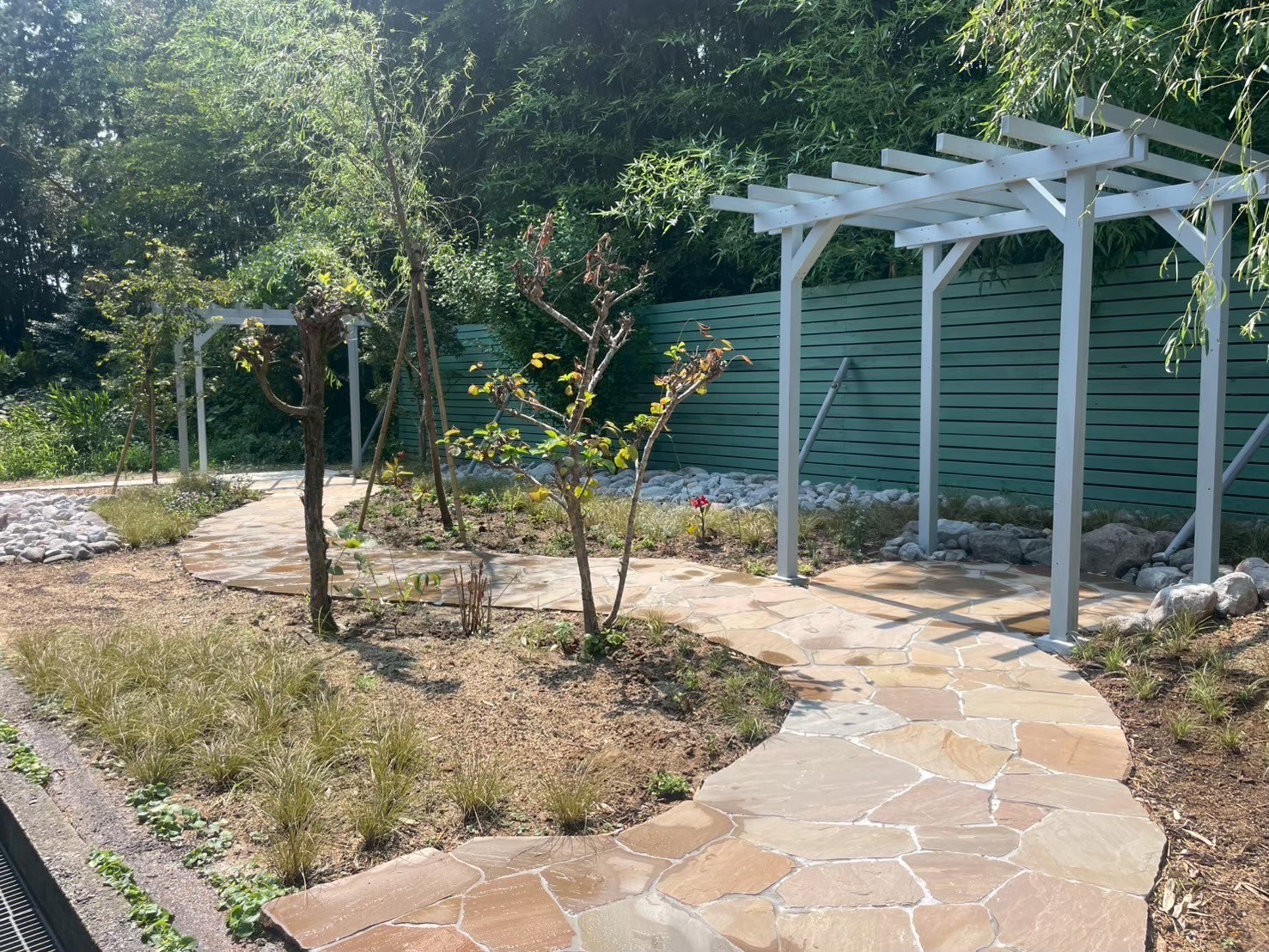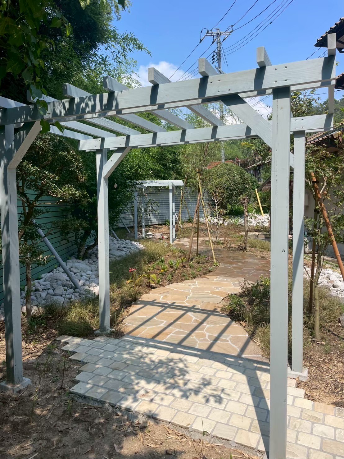 乱形石で道を作り、木製のパーゴラで景色を眺めることのできる空間に。